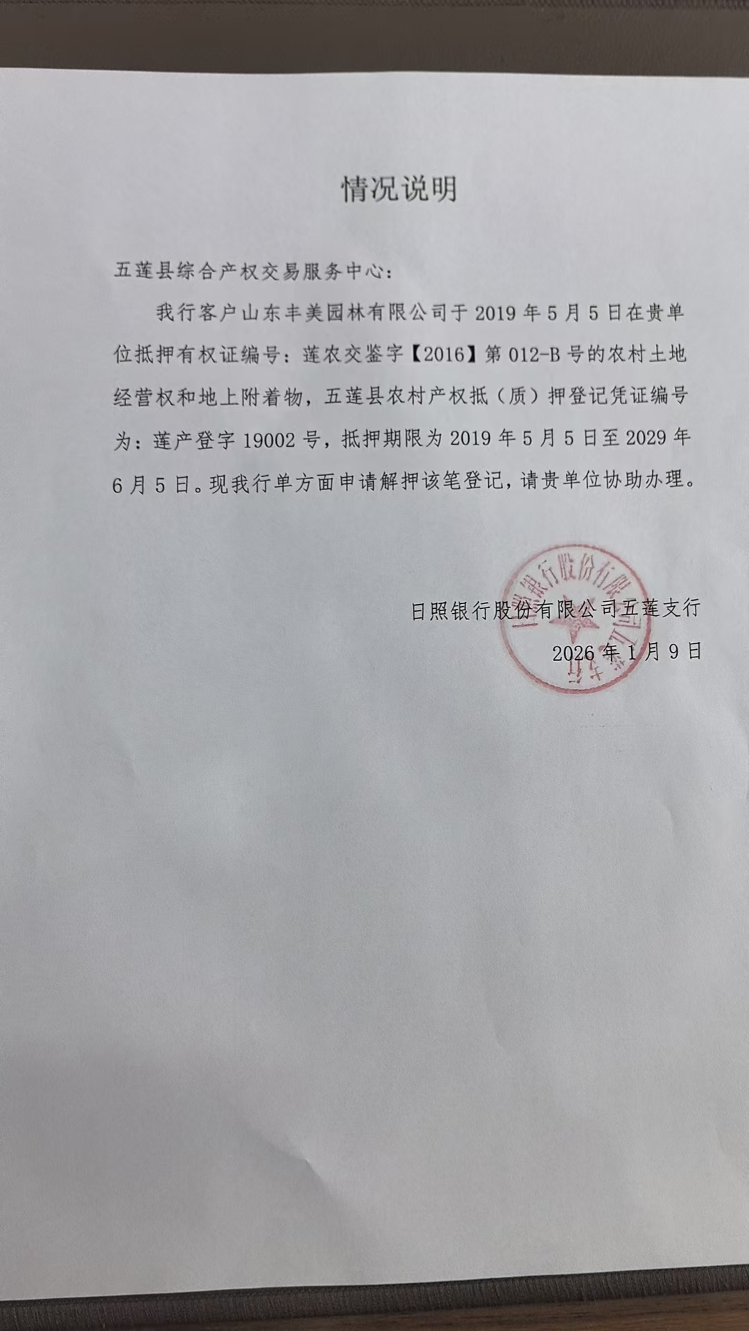 山东丰美园林有限公司于2019年5月申请办理(编号为证莲农交鉴字【2016】第012-B的农村土地经营权和地上附着物进行抵押)的农村产权抵(质)押登记凭证(编号:莲产登字19002号),现根据日照银行股份有限公司五莲支行的情况说明(附后)将该抵押登记凭证进行注销。