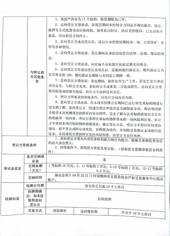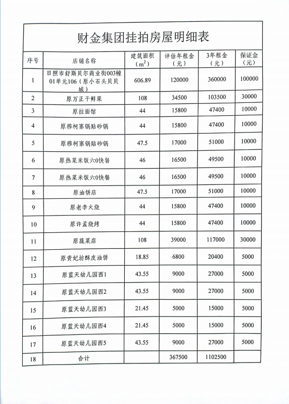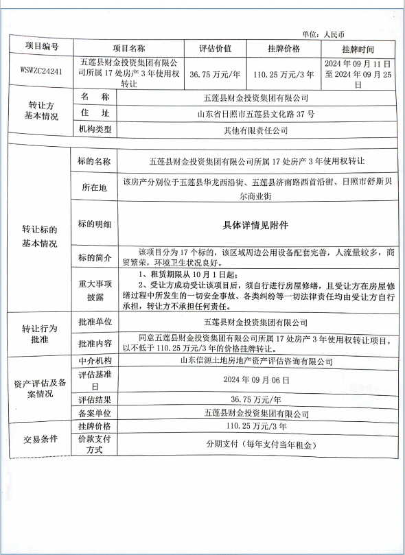 五莲县财金投资集团有限公司所属17处房产3年使用权转让